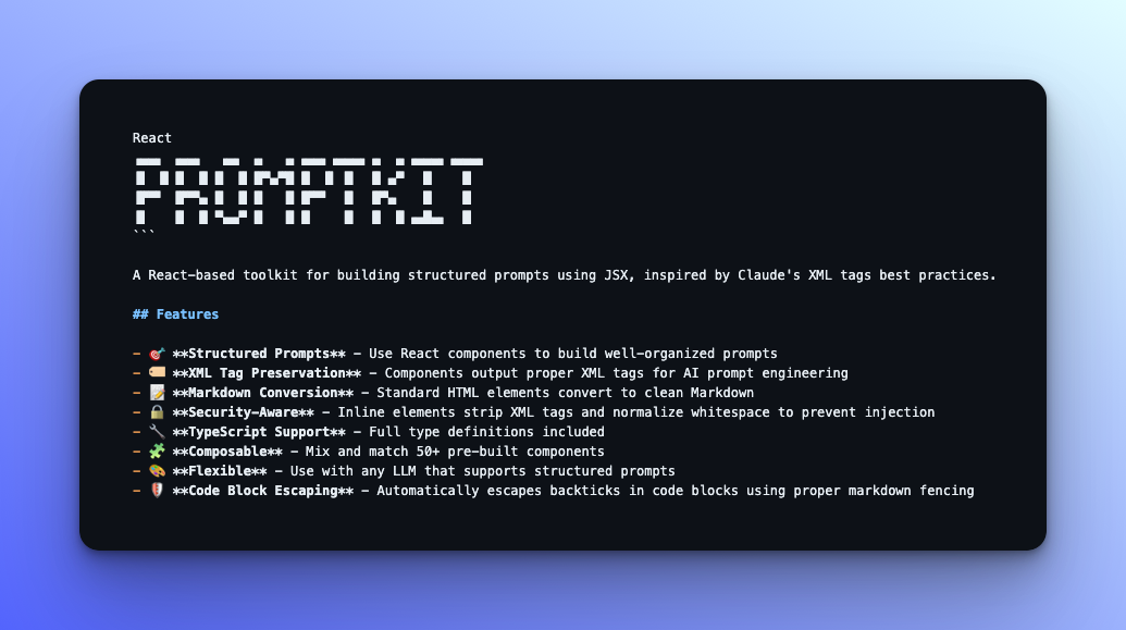 We're excited to announce the release of React Prompt Kit, an open-source, React-based toolkit for building structured prompts using JSX, inspired by Claude's XML tags best practices.