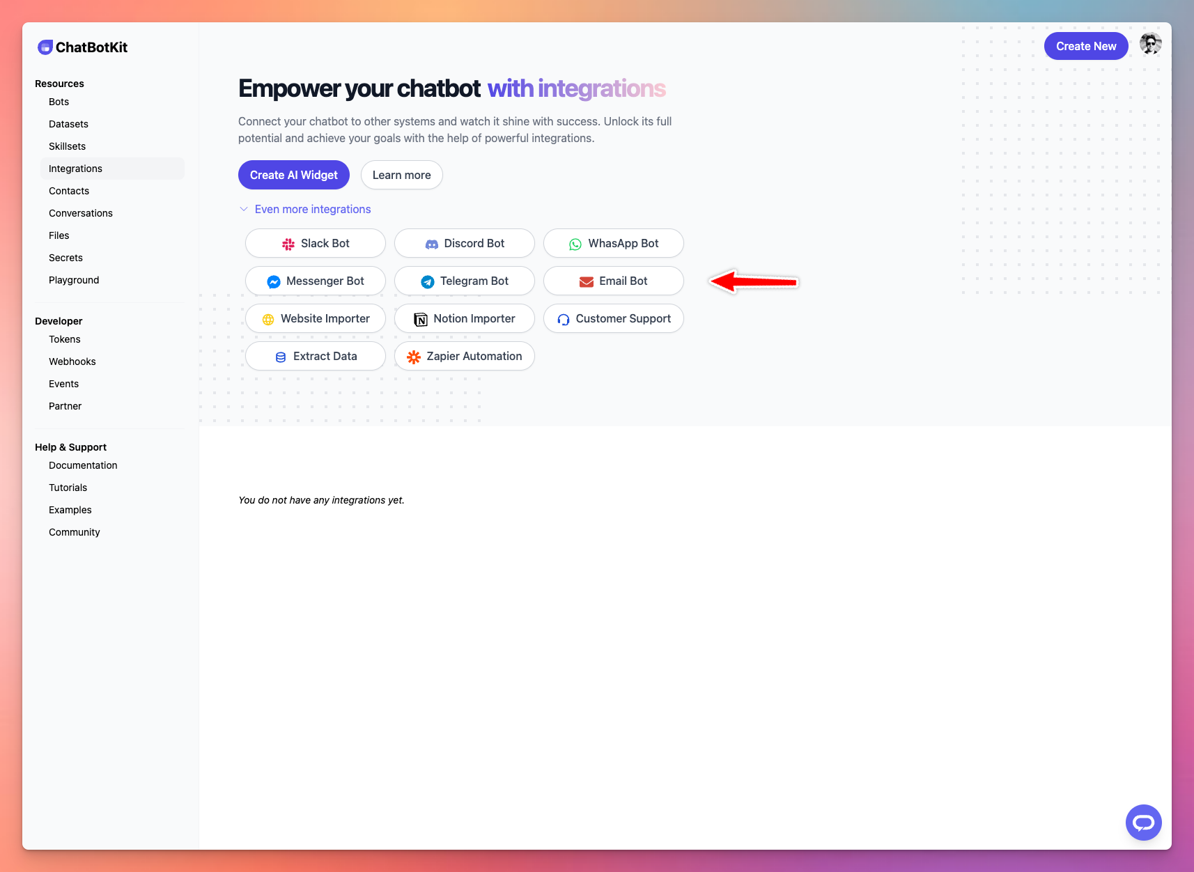 1. Navigate to Integrations: From the main dashboard of ChatBotKit, go to the 'Integrations' section. Here you can see various integration options. Click on the 'Email Bot' option to start the setup.